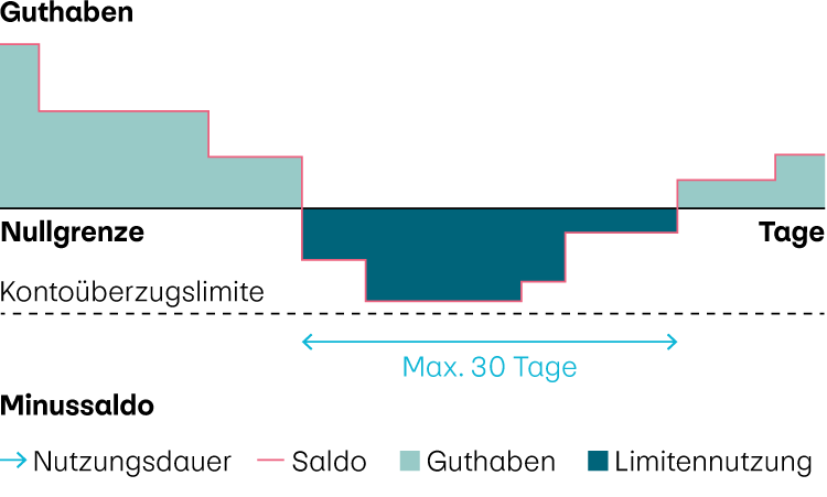 Nach erfolgreich durchgeführter Prüfung wird die Vereinbarung abgeschlossen und die Überzugslimite auf Ihrem Geschäftskonto ausgesetzt. Bis zur definierten Limitenhöhe dürfen Sie das Geschäftskonto während einer Dauer von maximal 30 Tagen in Folge überziehen. Spätestens nach 30 Tagen bzw. einmal pro Monat muss das Geschäftskonto einen positiven Saldo aufweisen.