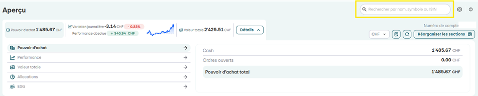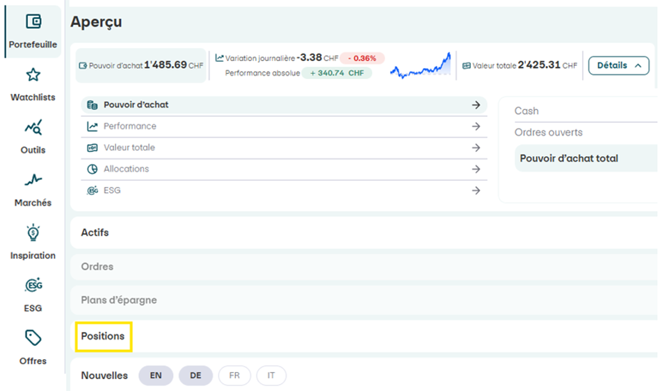 Vos positions en titres se trouvent désormais sous le point de menu « Portefeuille » dans « Aperçu ».