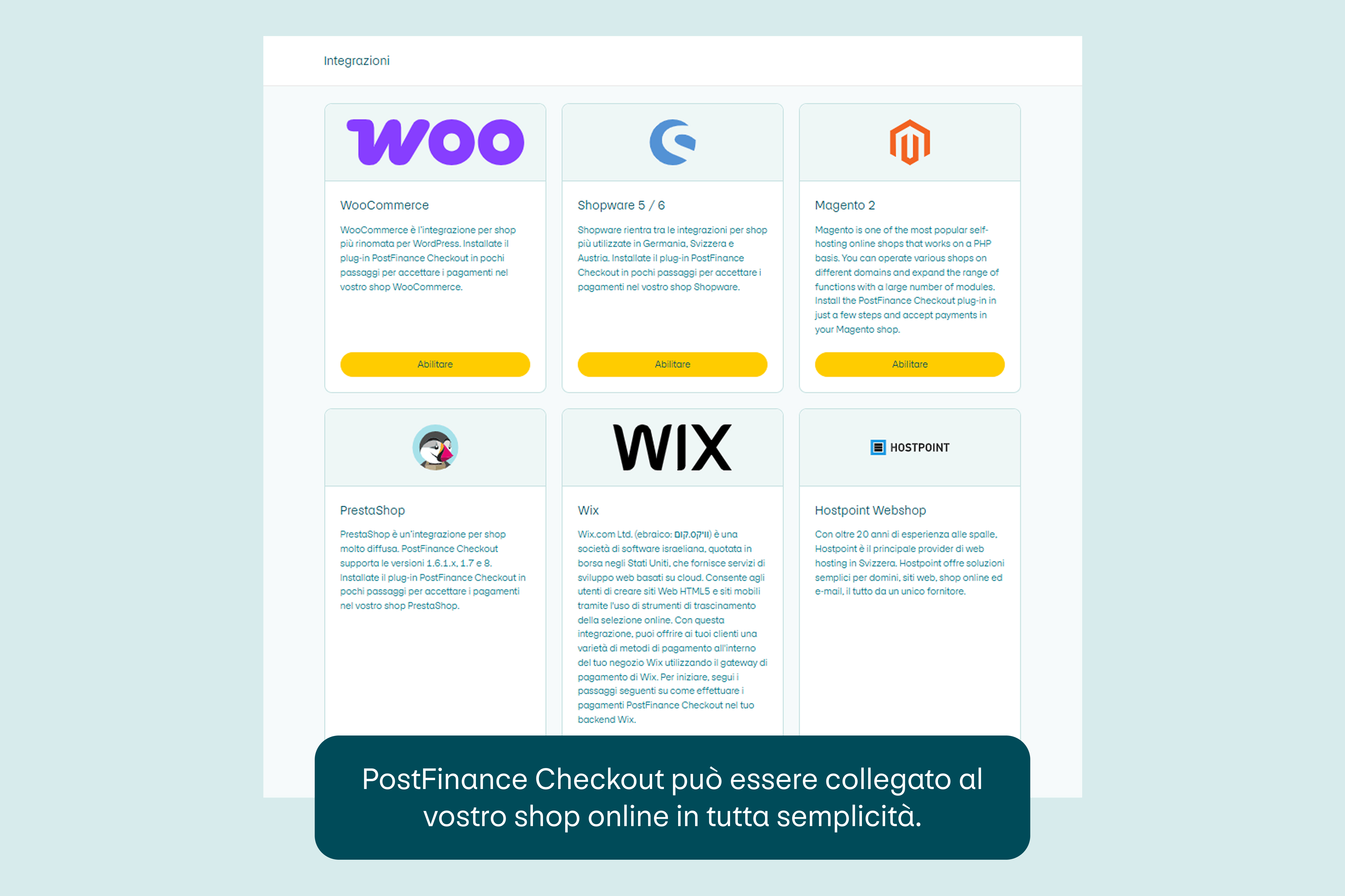 Con la soluzione di pagamento Checkout, PostFinance propone un’offerta ritagliata su misura in base alle dimensioni e alle esigenze della vostra azienda grazie ai diversi piani tariffari. Le modalità di pagamento richieste possono essere integrate nello shop online in tutta semplicità tramite plug-in, per un’esperienza di acquisto comoda e sicura.